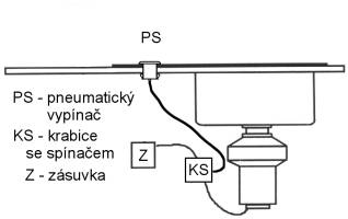 - krabice se spínačem má kabel délky 100 cm se zástrčkou do el. síťe, na krabici je zásuvka pro připojení drtiče odpadu.